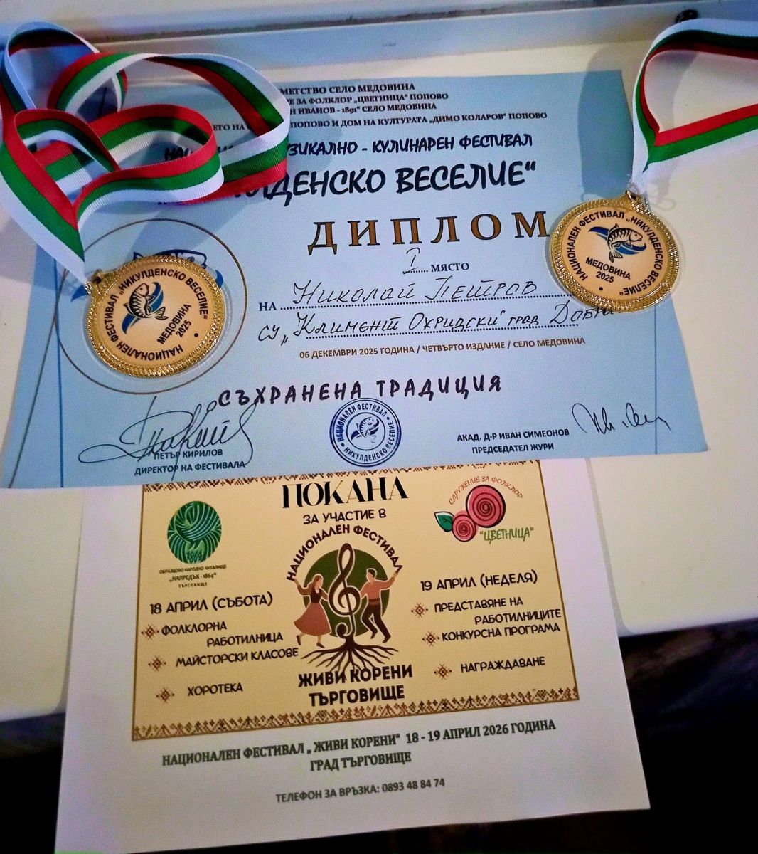 Николай Петров, ученик от СУ „Св. Климент Охридски“ в Добрич, отново се представи отлично и завоюва престижно отличие на Националния музикално-кулинарен фестивал „Никулденско веселие“, проведен в село Медовина, община Попово.