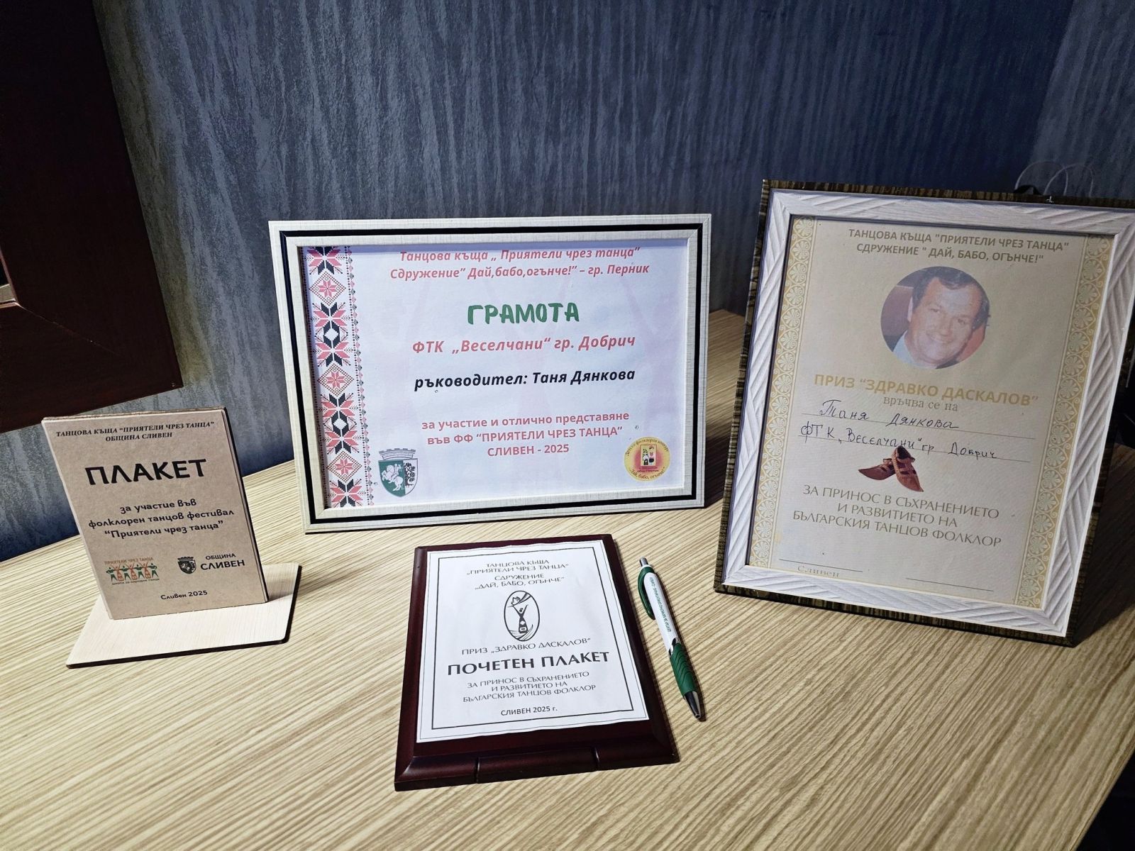 Ръководителят на фолклорен танцов клуб „Веселчани“ – гр. Добрич, Таня Дянкова, получи приз на името на бившия хореограф на ансамбъл „Добруджа“ – Здравко Даскалов.