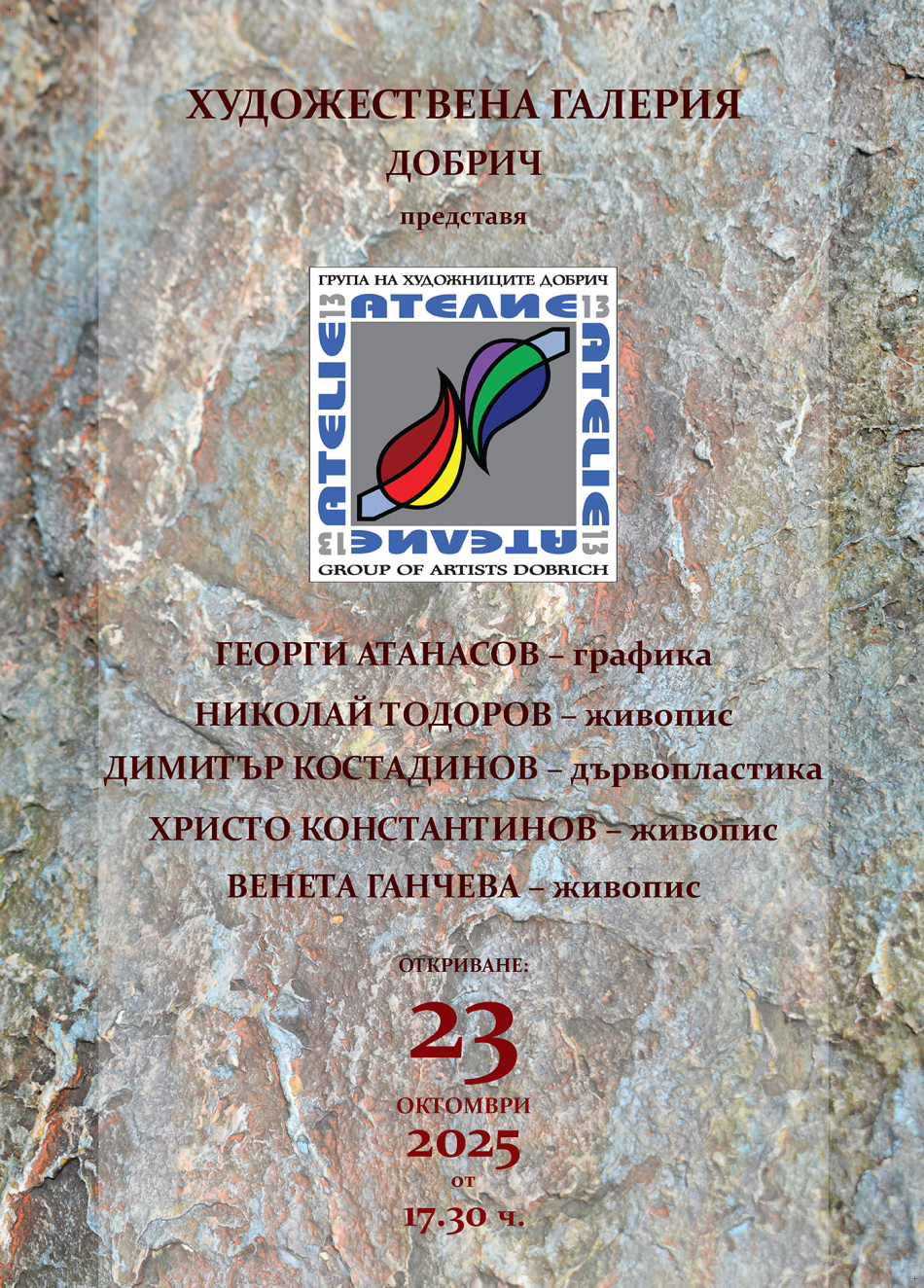 На 23 октомври от 17:30 ч. в Зала 1 на Художествена галерия – Добрич ще бъде открита поредната изложба на „Ателие 13“ – творческо сдружение на художници от града.