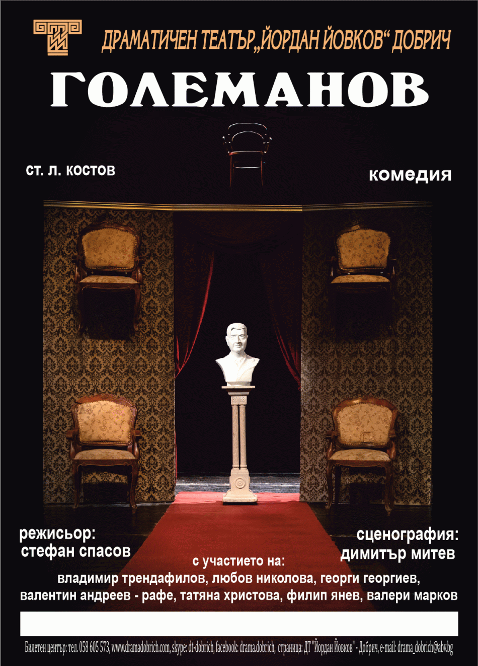 "Големанов" - от Ст. Л. Костов е новото заглавие в афиша на ДТ „Йордан Йовков“. Предпремиера на спектакъла е предвидена за 30 юни от 19.00 часа в голямата зала на театъра. Режисьор на постановката е Стефан Спасов, сценографията – на Димитър Митев. В ролите влизат актьорите Владимир Трендафилов, Любов Николова, Георги Георгиев, Валентин Андреев-Рафе, Филип Янев, Татяна Христова и Валери Марков.