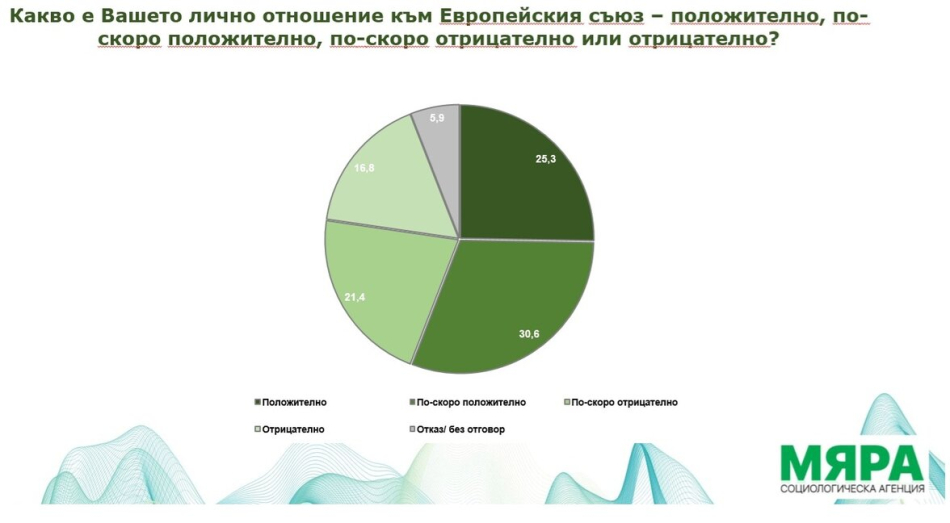Над 55% от българите имат положително отношение към Европейския съюз, докато 37% са против, като подкрепящите са предимно млади хора. По-критично настроени са възрастните.