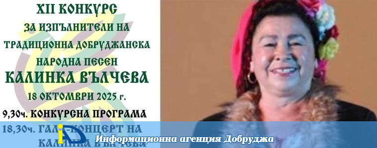 12-ото издание на конкурса за изпълнители на традиционна добруджанска народна песен „Калинка Вълчева“, ще се проведе днес в гр. Тервел. На своя личен празник именитата народна певица, заедно с колегите си от професионалното жури и с организаторите на конкурса, ще посрещне 46 индивидуални изпълнители и 14 групи от цялата страна. Събитието се организира и финансира от Община Тервел и е под патронажа на кмета на общината инж. Симеон Симеонов.