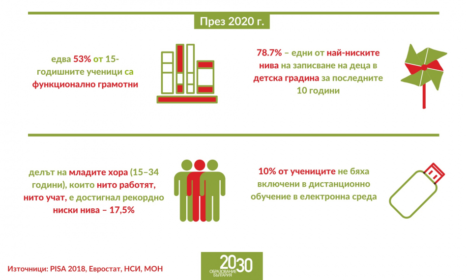 Едва 53% от 15-годишните ученици са функционално грамотни. През учебната 2019/2020 г. се отчитат едни от най-ниските нива на записване на деца в детска градина за последните 10 години - 78.7%. През 2019 г. делът на младите хора (15-34 години), които нито работят, нито учат, е достигнал рекордно ниски нива - 17,5%. 10% от учениците не бяха включени в дистанционното обучение в електронна среда. Това са част от изводите в традиционния мониторингов доклад на сдружение "Образование България 2030".