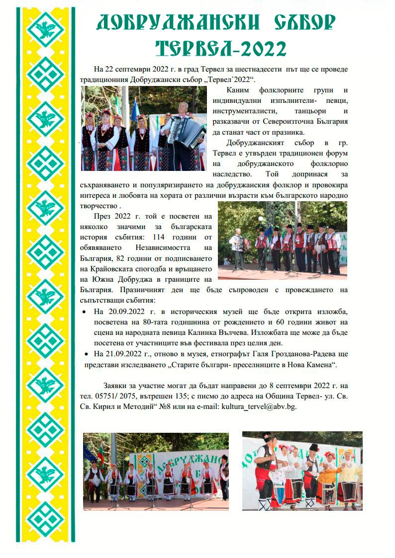Добруджанският събор в гр. Тервел е утвърден традиционен форум на добруджанското фолклорно наследство.