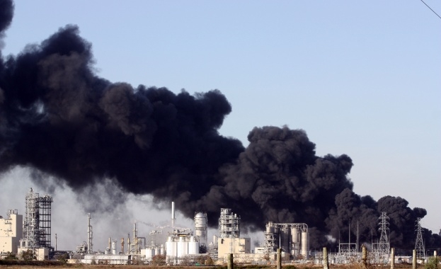 Пожарът е бил предшестван от две силни експлозии. Противопожарни екипи вече са на място. Над града се стели гъст черен пушек.