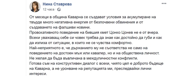 Кметът Нина Ставрева отказа да коментира случая, но публикува мнението си в своя фейсбук профил. В него тя заявява, че: „Провокативното поведение на бившия кмет Цонко Цонев не е от вчера. Всеки уважаващ себе си човек трябва да знае как достойно да губи и как да излиза от ситуации, в които не се чувства комфортно”.