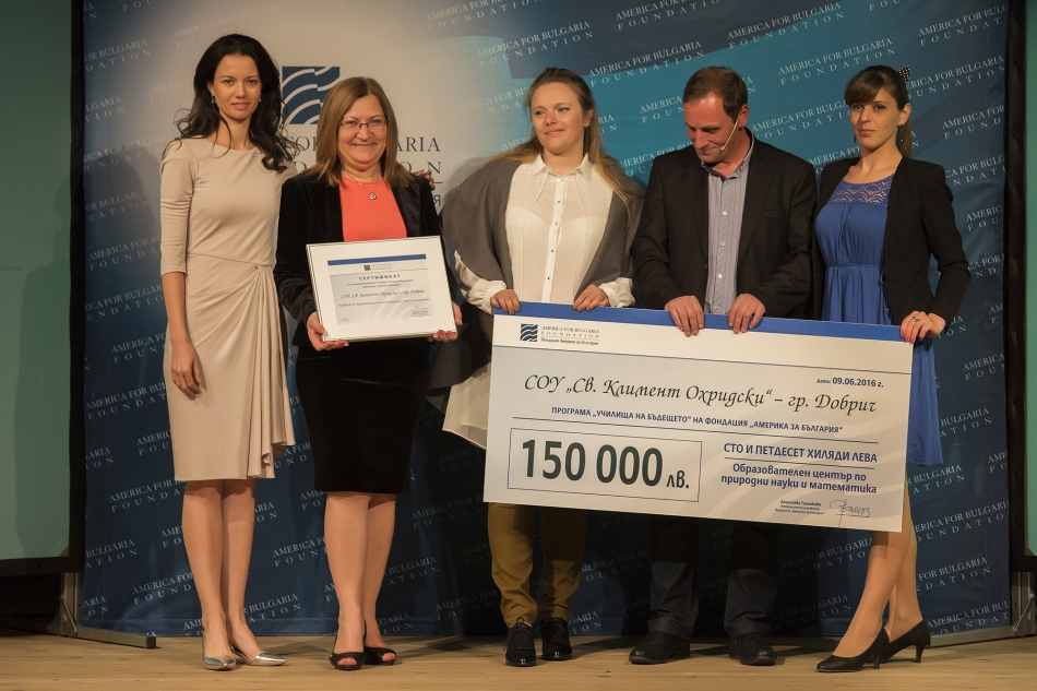 Днес, на официална церемония в София, Фондация „Америка за България“ връчи чек и сертификат на СОУ „Св. Климент Охридски”, Добрич. То е сред 23-те финалисти в конкурса „Училища на бъдещето“, които ще получат до 200 000 лева от фондацията за модернизация на учебната среда. Фондация „Америка за България“ дари общо 2,6 милиона лева в конкурса „Училища на бъдещето“ на 23 български училища за обновяване на учебната среда.