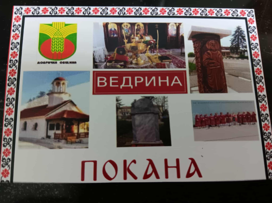 В ранния следобед, в 13.30 ч. с изпълнение на оркестър „Гочев бенд“ ще започнат тържествата на площада пред кметството в с.Ведрина. Официалното откриване на празничната програма ще е в 14 ч., като в нея участие ще вземат децата от детската градина в селото, Салса клуб „Десита“ от Добрич, певческа група при НЧ „Жътвари“- Добрич, танцов състав „Българилци“ при НЧ „Пробуда“ кв.Рилци, певческа група при НЧ „Асен Златаров“ –Генерал Киселово, община Вълчидол, детска певческа група при НЧ „Мевляна – Добрич, певицата Нелина Иробалиева и гайдаря Атанас Атанасов, възпитаници на Националното училище за фолклорни изкуства „Филип Кутев“ – Котел.