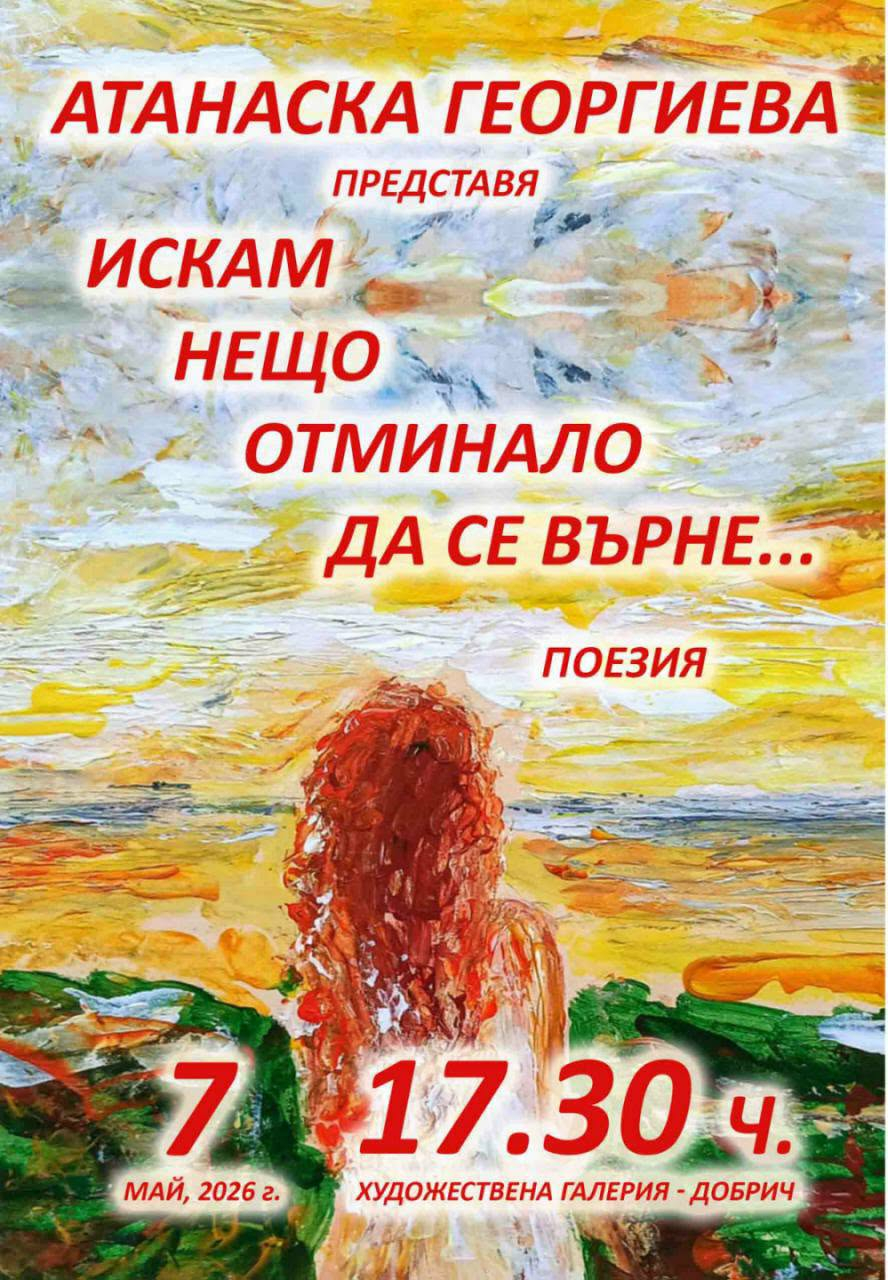 На 7 май, от 17.30 ч., в Художествената галерия в Добрич Атанаска Георгиева ще представи втората си поетична книга „Искам нещо отминало да се върне…“. Авторката е позната като педагог, литератор, създател на учебни помагала по български език и литература, поет, общественик. Досега са издадени пет нейни творби.