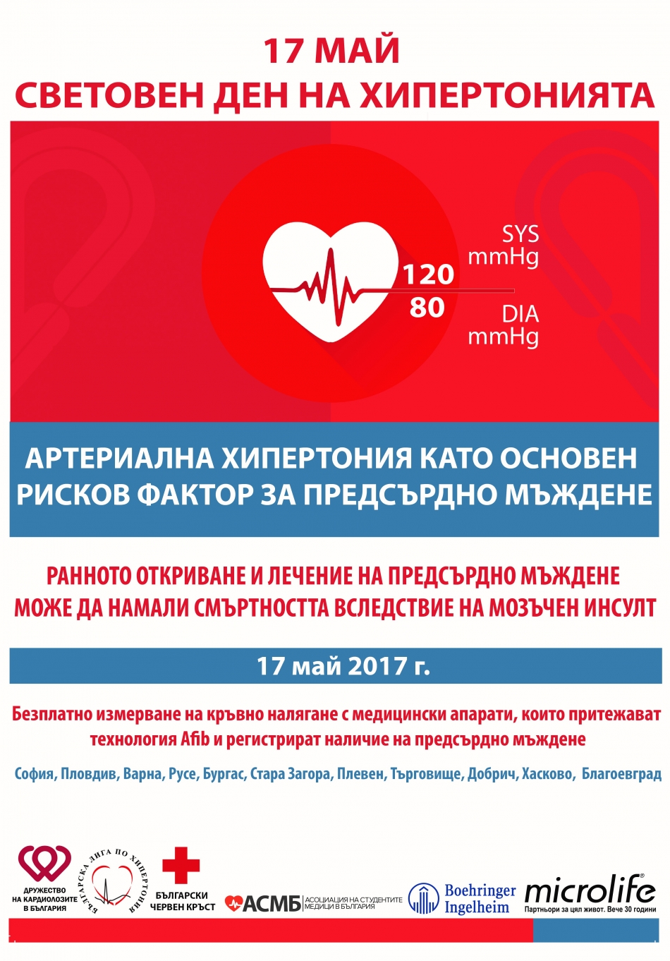 Всяка година 17 май протича под различно мото,за де се повиши информираността на гражданите по различни въпроси, свързани с високото кръвно налягане. Тази година вниманието е насочено специално към предсърдното мъждене (ПМ), към причинната връзка с артериалната хипертония и мозъчния инсулт.