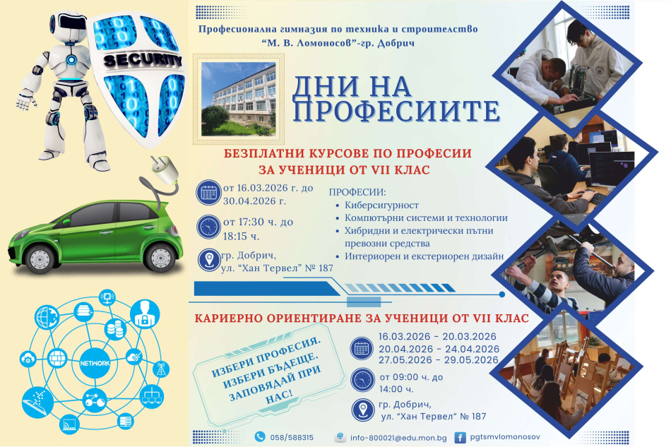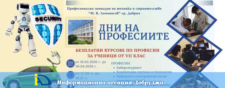Безплатни курсове по професии организира Професионална гимназия по техника и строителство „М. В. Ломоносов“ – град Добрич.