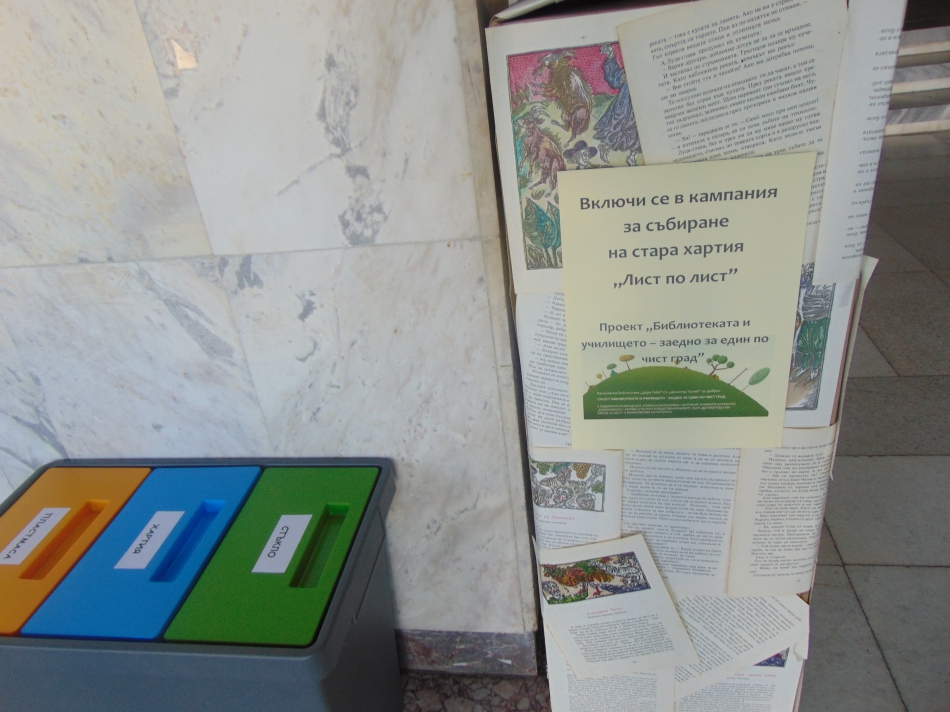 Регионална библиотека „Дора Габе” и СУ „Димитър Талев” дадоха старт на кампания за събиране на стара хартия под мотото „Лист по лист”, която е част от дейностите по проект „Библиотеката и училището – заедно за един по-чист град”, който се реализира с подкрепата на Фондация „Глобални библиотеки – България” в рамките на конкурс „Библиотеката – активен участник в обществения живот” в изпълнение на договор с Министерство на културата. В кампанията ще се включат всички участници в проекта – деца, родители, библиотекари, участниците в Летен детски клуб „Играй и учи”, читатели на библиотеката, граждани. Специална кутия е поставена във фоайето на първия етаж на библиотеката и в нея гражданите могат да оставят хартията, която носят.