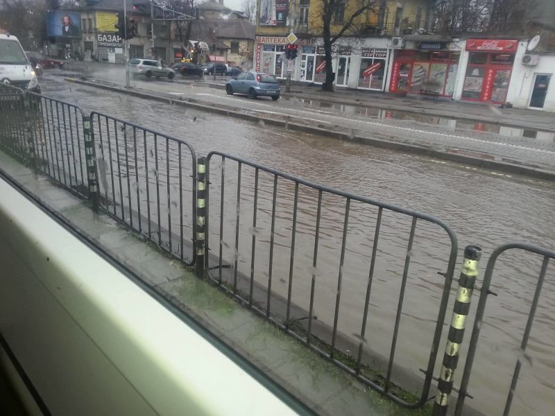 Едно от платната на пътната артерия е останало под вода - в участъка между Горнобански път и кв. Павлово. Колите трудно остават в една лента и преминават с повишено внимание.