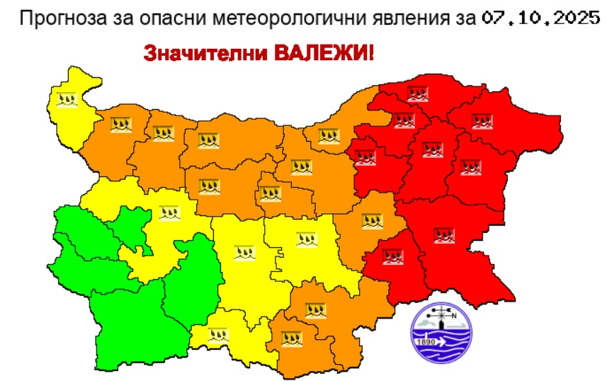 Националният институт по метеорология и хидрология издаде Червен предупредителен код за значителни валежи издаде за утре (7 октомври), за 8 области в Източна и Североизточна България.