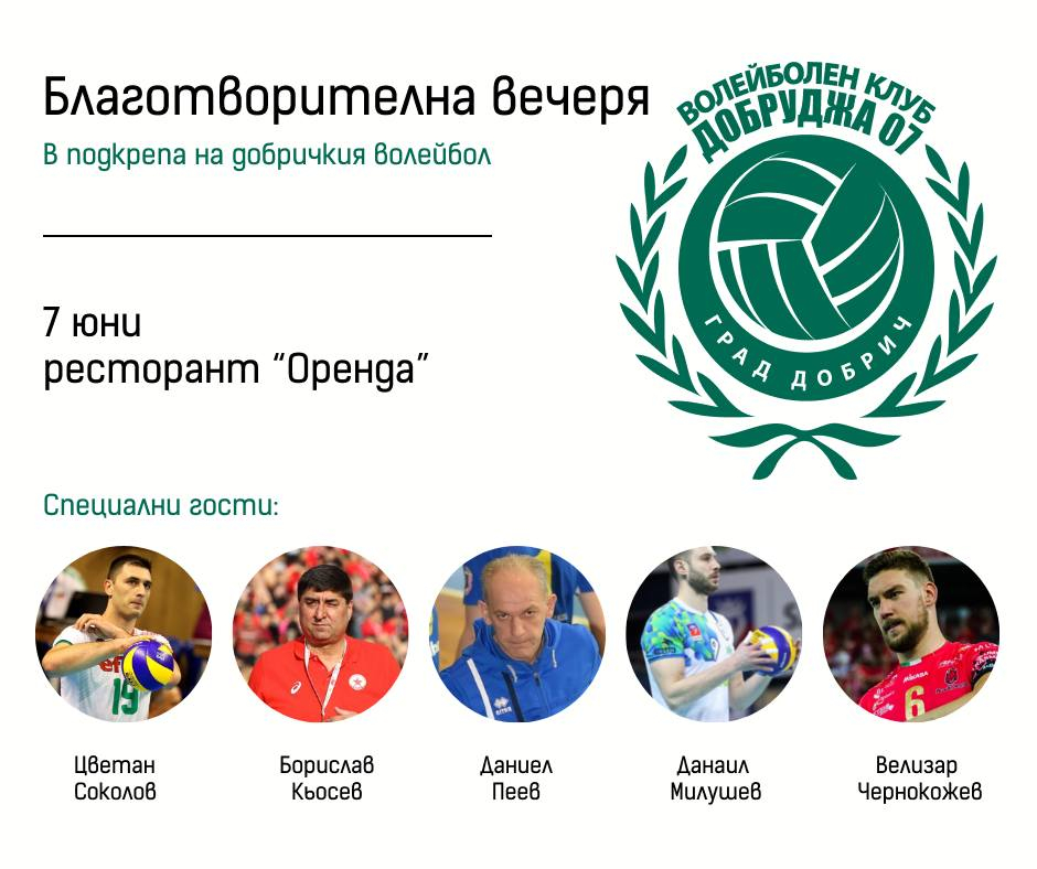 Редица известни български волейболисти ще подкрепят каузата на Добруджа 07 и ще присъстват на благотворителната вечеря, която организира ръководството на добричкия волейболен клуб. Борислав Кьосев, Цветан Соколов, Велизар Чернокожев, са част от имената, които ще присъстват на събитието, което ще остави незабравими спомени. Сред присъстващите ще бъдат настоящият треньор на мъжкия тим Данаил Милушев, както и Цветан Тодоров, Милен Узунов Даниел Пеев, които бяха част от славния тим на Добруджа от сезон 1996/97 година, станал вицешампион на България.