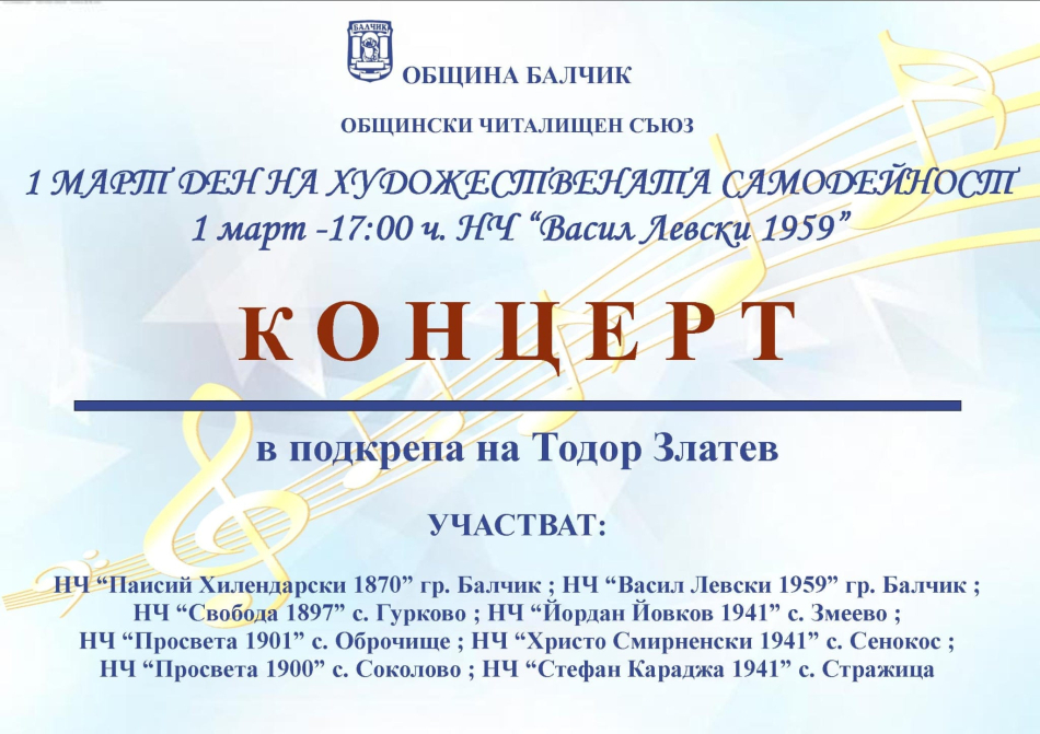 На Деня на художествената самодейност, Община Балчик и Общинският читалищен съюз организират концерт с благотворителна кауза в подкрепа на Тодор Златев – жител на града, страдащ от гноен хидраденит. Тържеството ще се проведе на 1 март от 17 часа в Народно читалище „Васил Левски 1959“.
