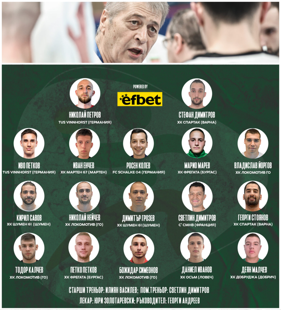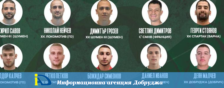 Група на националния отбор на България по хандбал за мъже: Николай Петров и Иво Петков (ТуС Финхорст, Германия), Стефан Димитров и Георги Стоянов (Спартак Варна), Иван Енчев (Мартен 67), Росен Колев (Шалке 04, Германия), Марио Марев и Петко Петков (Фрегата Бургас), Владислав Йоргов, Николай Нейчев, Тодор Калчев и Божидар Симеонов (Локомотив Горна Оряховица), Кирил Савов и Димитър Грозев (Шумен 61), Светлин Димитров (Шартр, Франция), Даниел Иванов (Осъм Ловеч) и Деян Малчев (Добруджа).