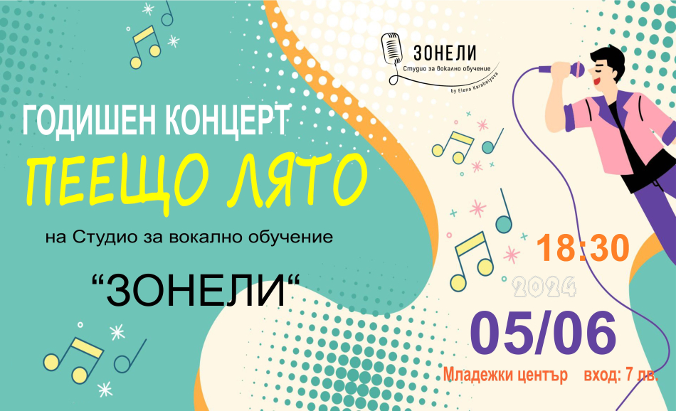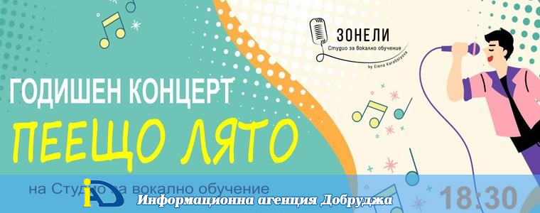 Днес от 18:30 ч. в концертната зала на Младежки център - Добрич ще се състои годишният концерт „ПЕЕЩО ЛЯТО“ на Студио за вокално обучение „Зонели“. Възпитаниците на вокалния педагог Елена Карабельова, от най-малките до най-големите, са подготвили множество хубави песни, които ще заредят публиката с емоция и лятно настроение.
