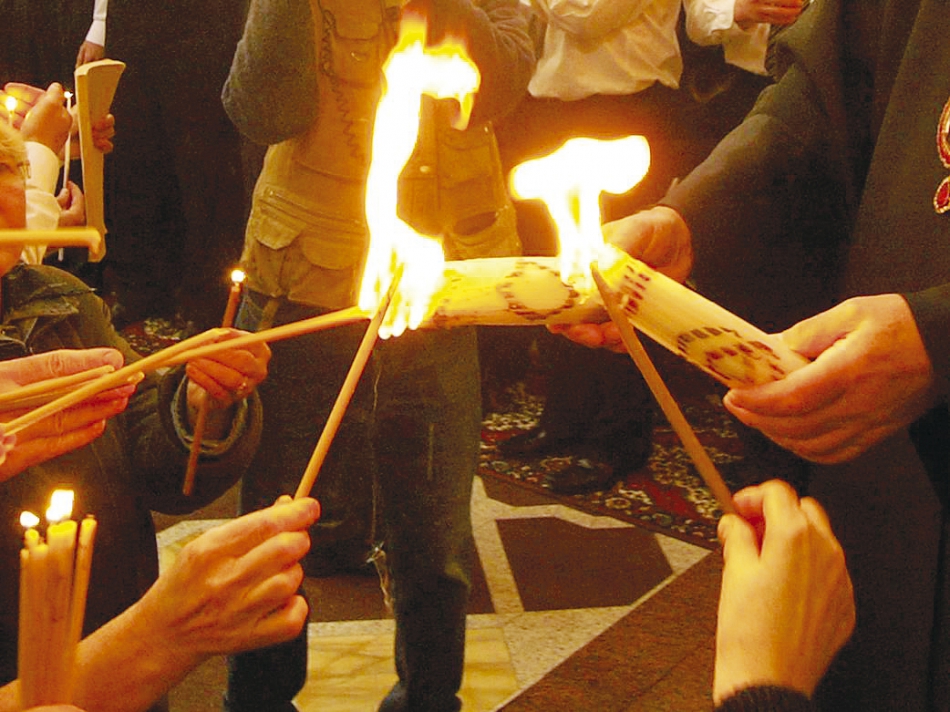 При слизането на Благодатния огън в параклиса е само йерусалимският патриарх. Известно време пламъкът не топли и не пари. С него патриархът