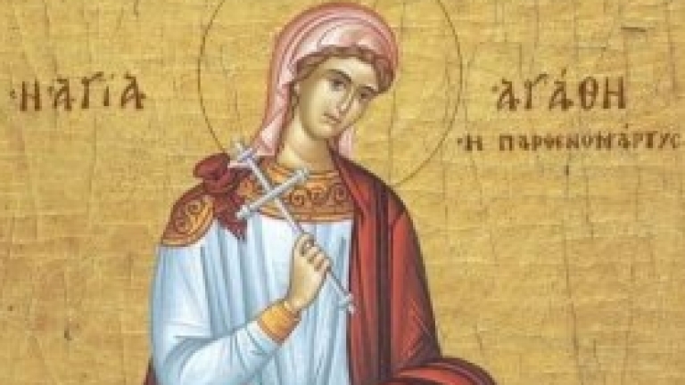 Света Агатия е живяла по време на римския император Декий (249-251), когато е имало жестоки гонения срещу християните. Във всички области на империята било заповядано да ги предават на мъчения и смърт. Агатия (Добра) е родена в Палермо (Сицилия) - била скромна християнка, славела се със своята красота, добродетел и знатен род. Родителите й оставили голямо богатство, но тя малко ценяла земните блага.