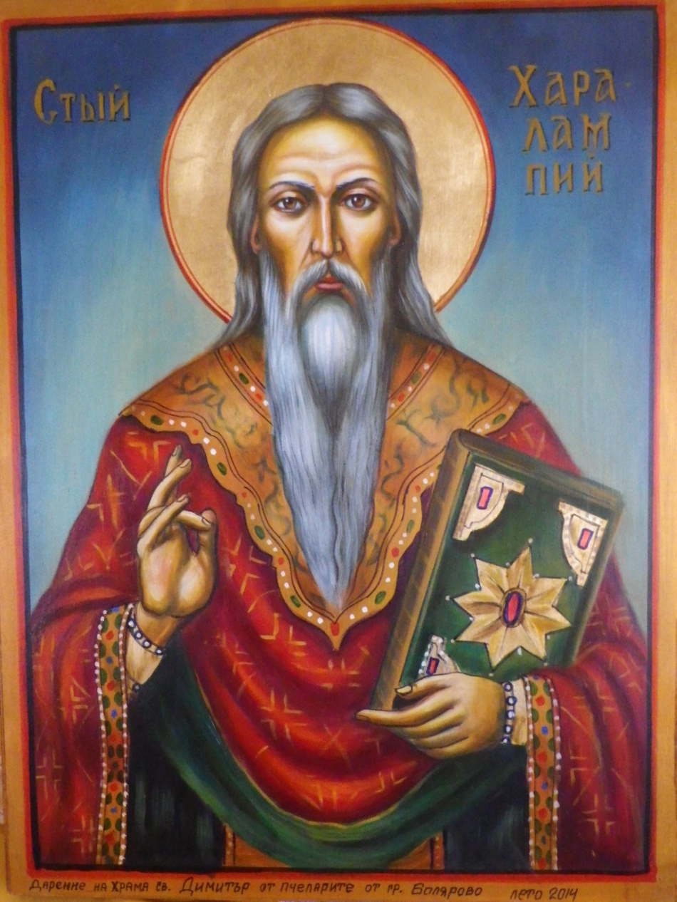 Св. свещеномъченик Харалампий бил епископ в Магнезия, Мала Азия, смел проповедник на вярата. Изправен на съд, напразно бил увещаван да се поклони на идолите. Предаден на мъчения, стъргали тялото му с железни куки. Раните по чудесен начин заздравявали. Мнозина езичници, като гледали твърдостта на вярата му и чудесното оздравяване, повярвали и били предадени на смърт. Осъден на посичане, св. Харалампий издъхнал, преди мечът да го докосне, по времето на Септимий Север в 198 година на 113 години.