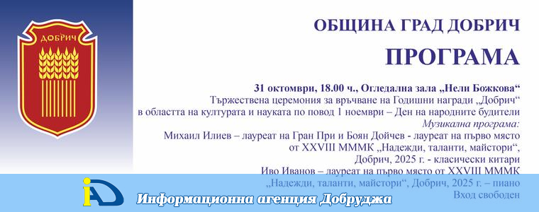 Тържествената церемония за връчване на годишните награди „Добрич” в областта на науката и културата по повод Деня на народните будители ще се състои днес от 18.00 часа в Огледална зала „Нели Божкова“.