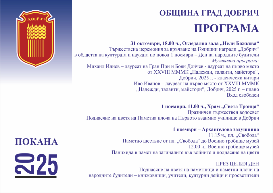 Навръх Деня на будителите, утре от 11.00 часа в храм „Света Троица” ще бъде отслужен празничен тържествен водосвет, а пред паметната плоча на Първото взаимно училище в Добрич ще бъдат поднесени цветя