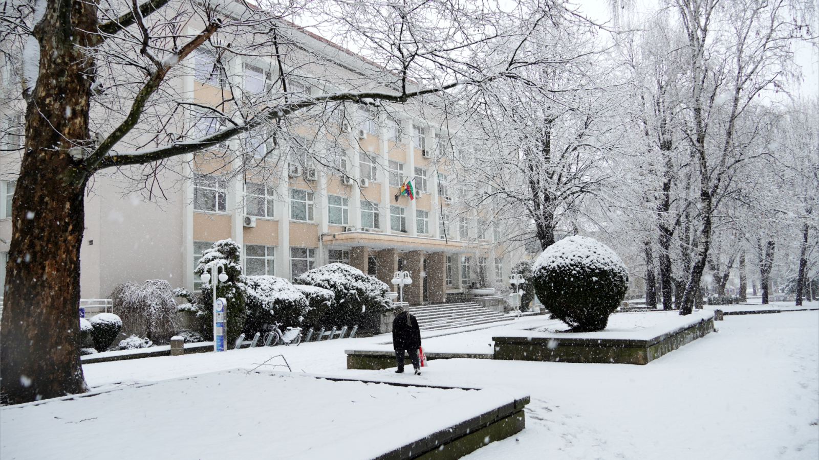 Само два дни след настъпването на астрономическата пролет, Добрич „побеля“ след снеговалежа, който започна тази сутрин. Макар снегът да създаде доста главоболия за водачите на автомобили по улиците, пешеходната зона в центъра на Добрич, е изключително красива в своята нова бяла „премяна“.