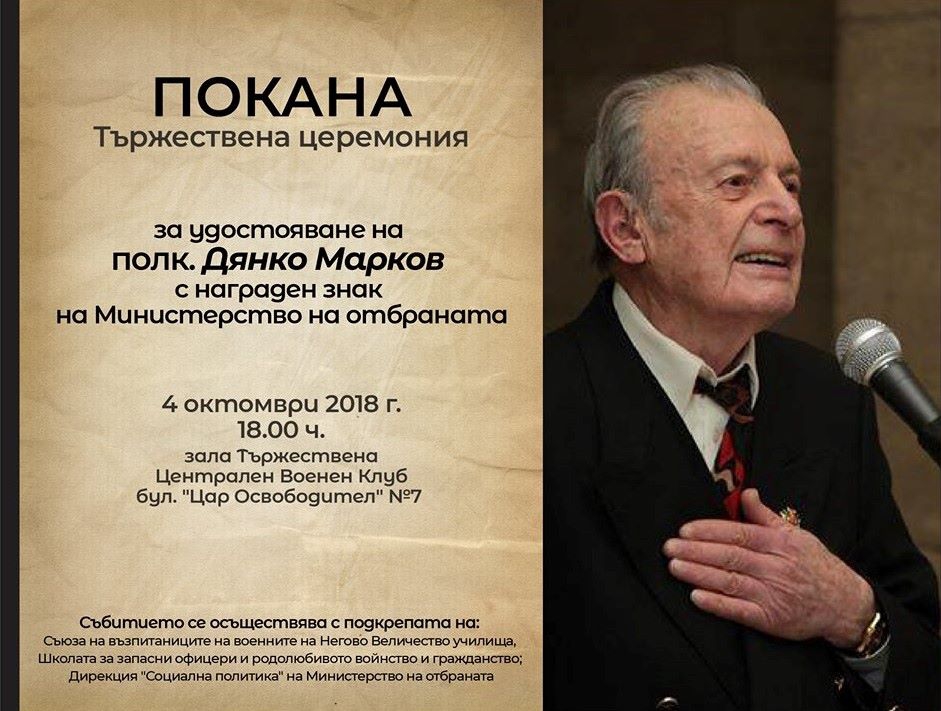 Днес 4 октомври 2018 г. полк. Дянко Марков навършва 96 години. По този повод и за достоен живот, отдаден в служение на род и Родина, той ще бъде удостоен с награден знак на Министерство на отбраната.