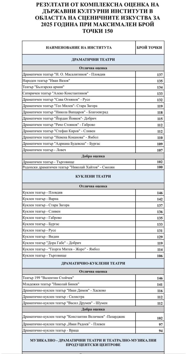 Драматичен театър „Йордан Йовков“ в Добрич получи отлична оценка в резултатите от комплексната оценка на държавните културни институти в областта на сценичните изкуства за 2025 година.