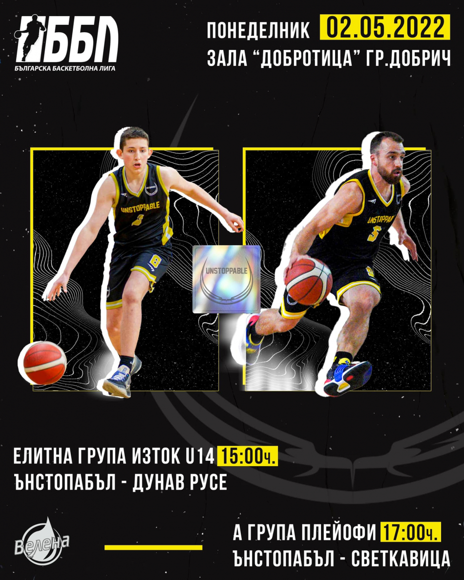 Баскетболен празник очаква феновете на този спорт в Добрич днес следобед. Два интересни мача ще се изиграят един след друг в зала "Добротица". Първо от 15.00 часа момчетата до 14 г. на "Ънстопабъл" приемат "Дунав" (Русе) в среща от Елитната група. След това, от 17.00 часа, мъжкият отбор на добричлии излиза срещу "Светкавица" в плейофите на А група. Входът и за двата мача е свободен за зрителите. Домакините излизат с амбицията за две победи. Момчетата до 14 г. се нуждаят от успех, за да запазят шансове за директно класиране на финалите. Мъжкият отбор на "Ънстопабъл" пък загуби първия мач в Търговище и при победа днес ще вкара серията в трета, решителна среща за класиране на полуфиналите в зона Изток на А група. Преди месец отборът игра пред рекордните за групата 900 зрители в зала "Добротица" в Добрич срещу "Шабла" и днес се очаква домакинството отново да се окаже важен фактор за крайния изход на мача.
