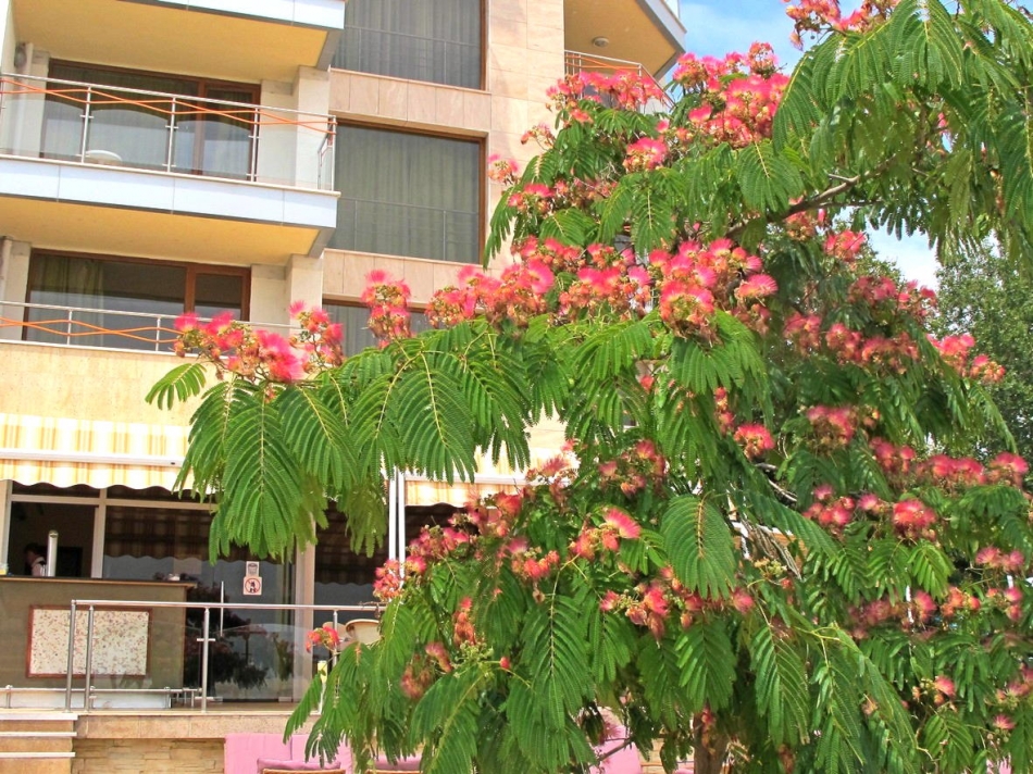 Гостите на ваканционно селище Албена имат възможността да се наслаждават на прекрасната зеленина дори в най-горещите месеци на сезона. Най-зеленият черноморски курорт в страната ни може да се похвали с изключително разнообразие на екзотични и красиви растителни видове. Един от тези видове е и Албицията, която в момента цъфти в близост до хотелите „Калиакра“ и „Фламинго Гранд“ в Албена. Ефектните и листа, копринено-меките й ярко розови цветове внасят полъха на източен разкош във всеки парк и градина. Това неголямо листопадно дръвче идва от югоизточната част на азиатския континент, но е много разпространено в субтропическите и част от умерените географски области на цялото Северно полукълбо. От рода е известен само един вид - Albizia julibrissin Durazz (Юлибрисиновата албиция или "Копринено дърво").У нас вирее чудесно по Черноморието и в цяла Южна България върху пропускливи и глинести почви. Обича сух и слънчев климат, чувства се добре на светли места и се отглежда лесно. Непретенциозно е и заедно с това достатъчно студоустойчиво - издържа при температури до -15 °.