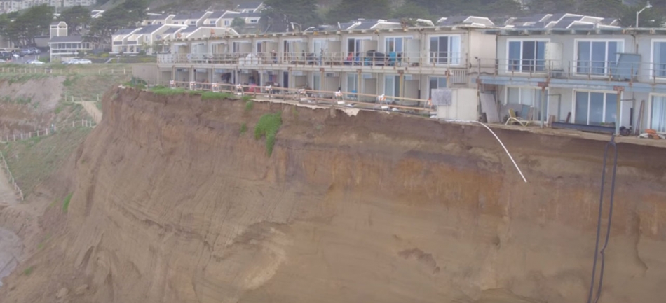 На филмчето се вижда как цели жилищни комплекси се клатят на ръба на скалите, а дворовете им се изсипват в океана.