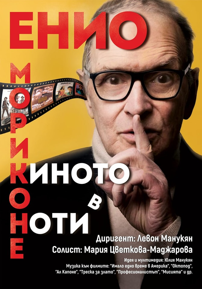 Концертът „Енио Мориконе – киното в ноти” ще започне от 18.00 часа под диригентската палка на маестро Левон Манукян, който е автор и на оркестрациите на известните музикални теми от света на киното, композирани от емблематичния Енио Мориконе.