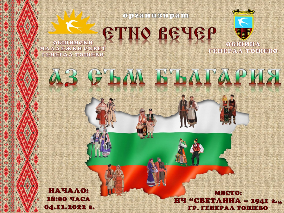Етно вечер ще се проведе за пореден път в Генерал Тошево. Началото на събитието, което е част от програмата, посветена на празника на града, е в 18.00 часа в НЧ „Светлина - 1941”. Събитието се организира от Общинския младежки съвет за пореден път с подкрепата на Община Генерал Тошево. Темата тази година е „Аз съм България“. Участие ще вземат децата от Центъра за работа с деца в Генерал Тошево.