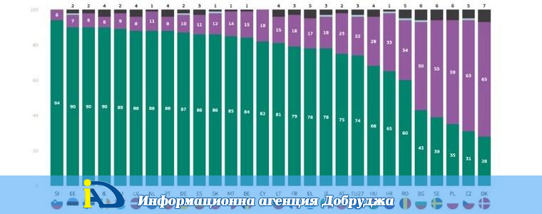 В България подкрепата за Украйна е по-ниска в сравнение с останалите държави от ЕС. 62% от България са против предоставянето на военна помощ за Украйна, а 32% - го подкрепят. В ЕС като цяло тенденцията е обратна - 59 на сто подкрепят предоставянето на военна помощ за Украйна, 36% са против.
