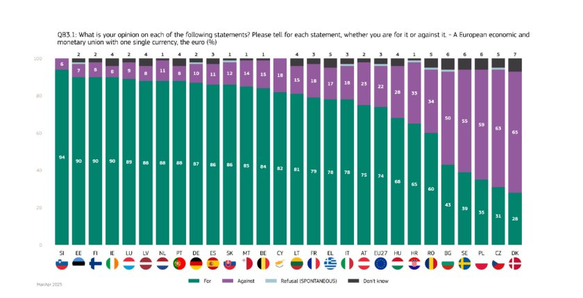 50% от българите са против еврото, а 43% го подкрепят. Това показват данните на последното проучване на Евробарометър, представено днес. В останалите държави от общността доверието към еврото расте. В 22 държави от ЕС мнозинството от запитаните подкрепят еврото. В пет държави, сред които и България, мнозинството от анкетираните са против еврозоната: България (50%), Швеция (55%), Полша (59%), Чехия (63%) и Дания (65%).
