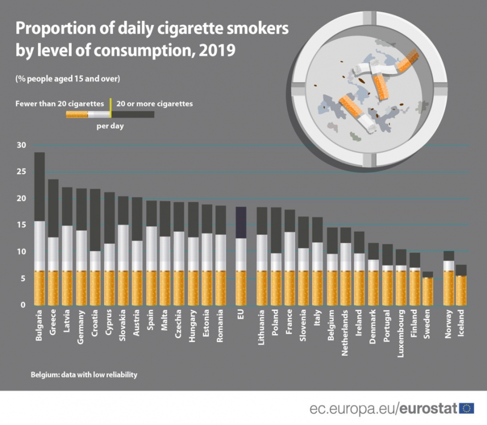 През 2019 г. 18,4% от населението на ЕС на възраст 15 и повече години заявяват, че пушат цигари всекидневно, сочат публикувани днес данни на Евростат. 12,6 на сто от европейското население пуши под 20 цигари на ден, а 5,9% пушат над 20.