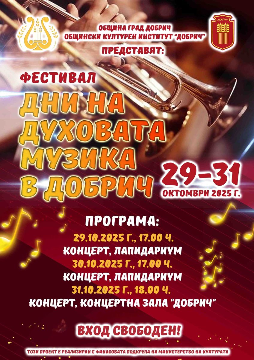 Първо издание на фестивал „Дни на духовата музика в Добрич“ започва днес и ще продължи до 31 октомври. Това е третият спечелен проект на Общински културен институт-Добрич, който се финансира по Програма за подкрепа на творчески проекти в областта на сценичните изкуства към Министерството на културата.