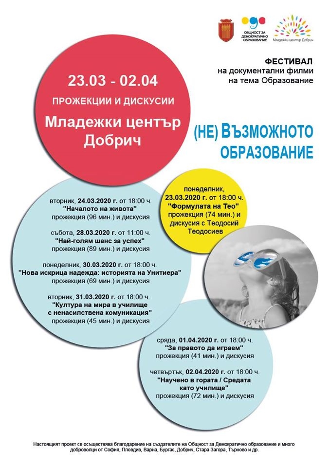 Фестивал на документалните филми на тема Образование ще се проведе в Младежкия център – Добрич от 23 март до 2 април. Стартът на събитието под наслов "(не)Възможното образование" ще бъде даден с прожекция на филма "Формулата на Тео", като на събитието ще присъства и популярният преподавател Теодосий Теодосиев.