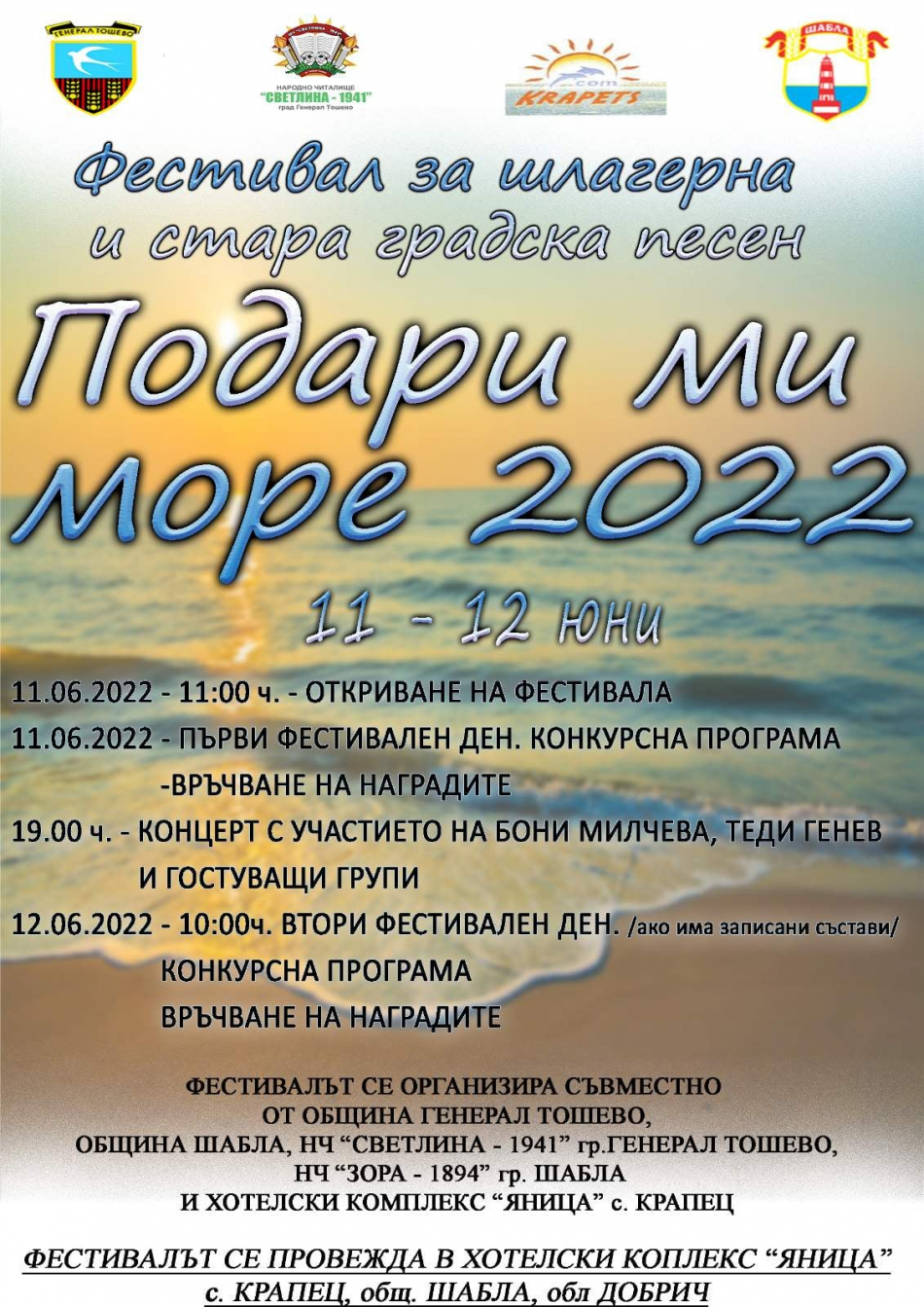 На 11 и 12 юни в Крапец ще се проведе поредното издание на Фестивал на старата градска и шлагерна песен „Подари ми море”. За поредна година музикалният форум ще събере в комплекс „Яница”, състави от цялата страна, които ще представят емблематични шлагерни и стари градски песни.