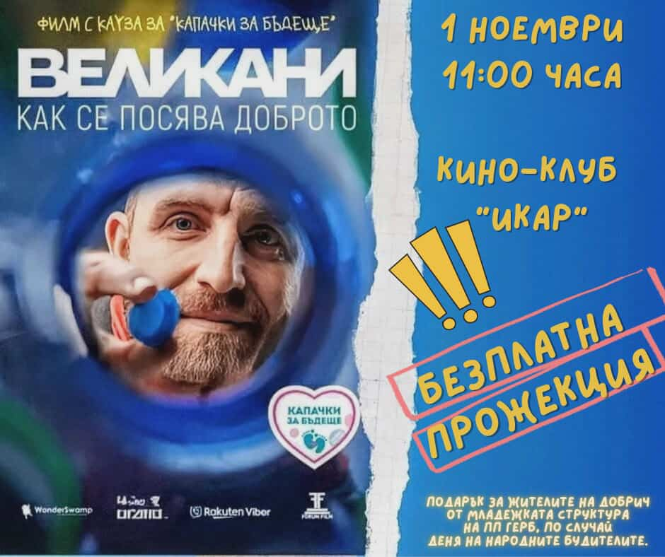 Филмът „Великани“, който разказва за каузата на „Капачки за бъдеще“, ще бъде излъчен безплатно на 1 ноември – Деня на народните будители. Прожекцията ще е от 11 ч. в кино „Икар“ и инициирана от младежката организация на ГЕРБ в Добрич с подкрепата на областния координатор Деница Сачева.