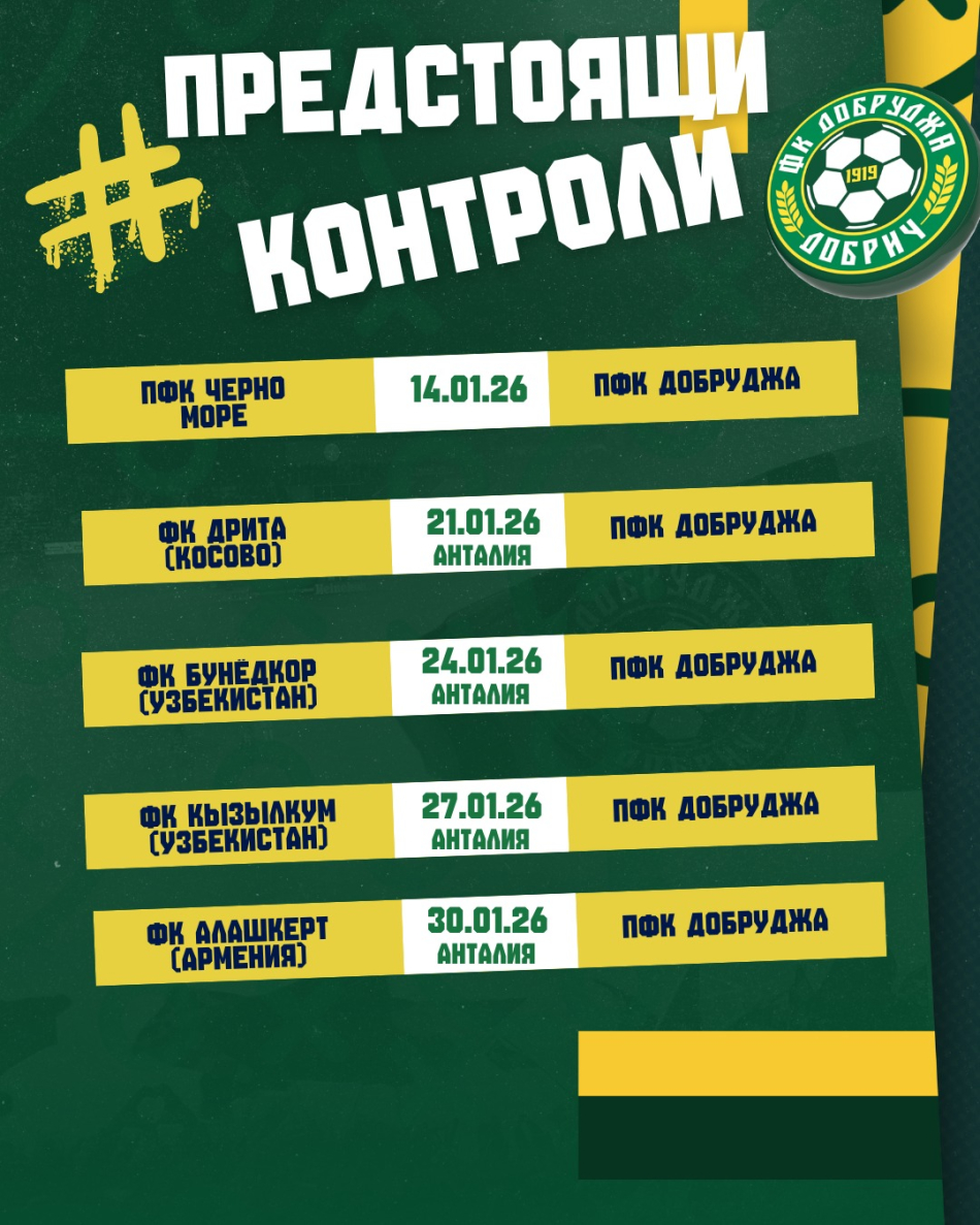 Общо пет контролни срещи са планирани за подготовката на Добруджа през зимната пауза. Четири от тези контроли ще се изиграят по време на лагера в Анталия, съобщиха днес от ръководството на клуба.