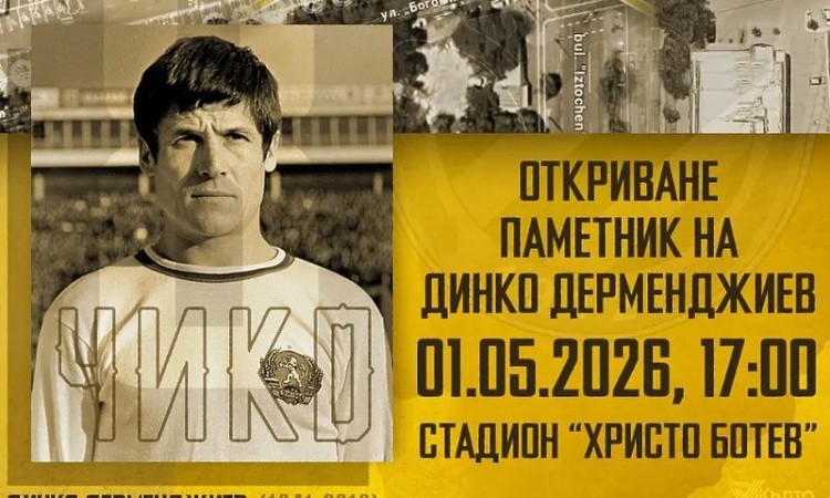 Паметникът на легендарния футболист на Ботев Пловдив - Динко Дерменджиев ще бъде открит на 1 май, съобщиха от Фондация "Жълто и Черно", която бе инициатор на кампанията по набирането на средства и изграждането на монумента. Събитието ще се състои от 17:00 часа пред стадион "Христо Ботев".