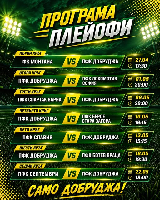Отборът на Добруджа ще започне с гостуване на Монтана на 27 април от 17:30 часа в мач от 31-вия кръг. В 32-рия кръг добруджанци приемат Локомотив София на 1 май от 20:00 часа.