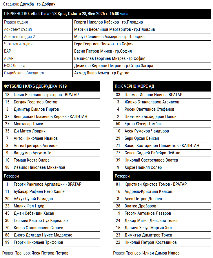 Тимовете на Добруджа и Черно море се изправят един срещу друг в мач от 23-ия кръг на Първа лига. Срещата на стадион “Дружба” е с начален час 15:00 и ще бъде ръководена от Георги Кабаков.