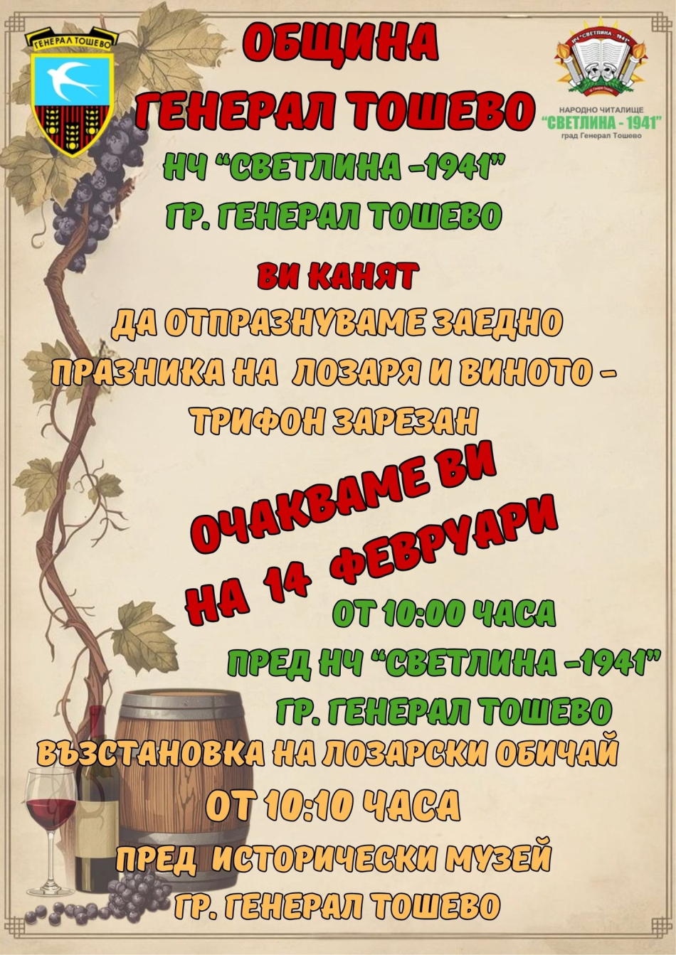 Празникът на лозаря и виното – Трифон Зарезан, ще бъде отбелязан тържествено в Генерал Тошево на 14 февруари. Инициативата се организира от Община Генерал Тошево и Народно читалище „Светлина – 1941“ .