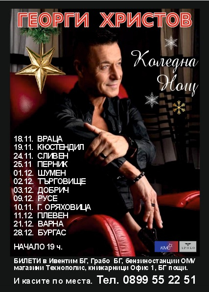 Тази година Коледната сцена ще бъде озарена от един от най-ярките и обичани български артисти. Георги Христов, чийто глас е символ на сила, нежност и изящество, кани публиката на незабравим Коледен концерт, изпълнен с музикална магия и емоция.