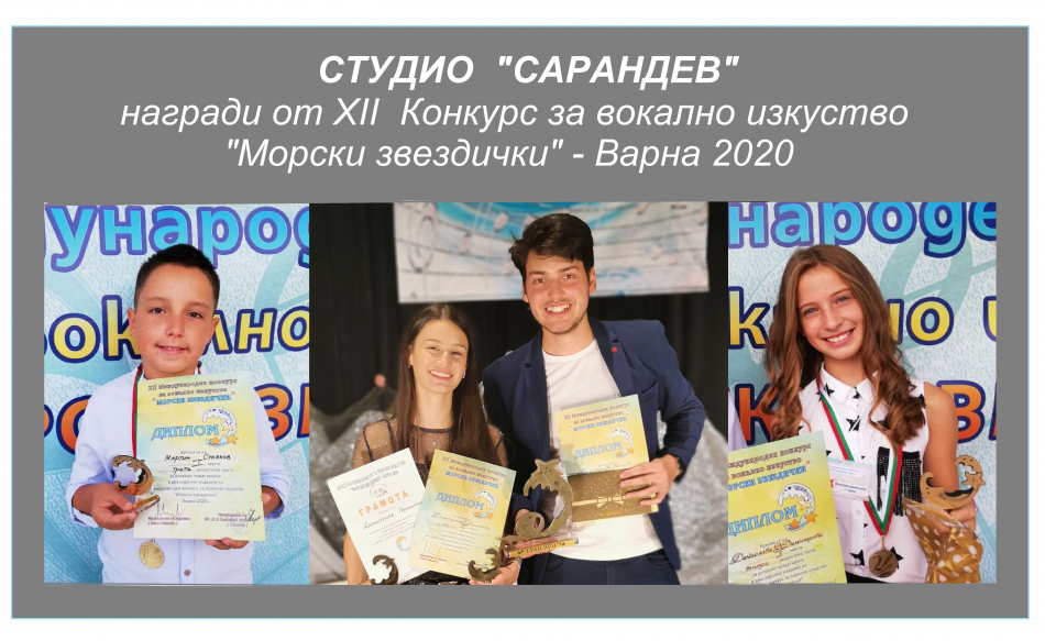 Гран при, четири първи награди и една втора спечелиха певците на Студио „Сарандев“ от конкурса „Морски звездички“ – Варна. Вторият етап на 12-ото издание на конкурса завърши снощи. Поп изпълнителите от Студио „Сарандев“ при Младежки център – Добрич с вокален педагог Елена Карабельова се представиха блестящо, като грабнаха най-престижните награди. ГРАН ПРИ на конкурса (грамота, приз и парична награда) спечели Александър Петров. Димитрина Германова си тръгна с първа награда в четвърта възрастова група. На нея й бе връчена и Специалната награда на организаторите - Народно читалище "П. Р. Славейков 1928" гр. Варна (грамота и парична награда). С първа награда е и Мартин Петров. Той е с най-високия резултат в своята група (трета). Денислава Димитрова се представи във втора възрастова група и спечели престижното второ място.