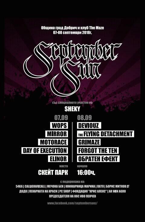 Припомняме общо 10 банди ще се качат двете вечери на сцената в скейт парка в градския парк на Добрич. Това са Grimaze, Мирър, Day of Execution, Forgot the Ten, The Flying Detachment, Deviouz и WOPS.